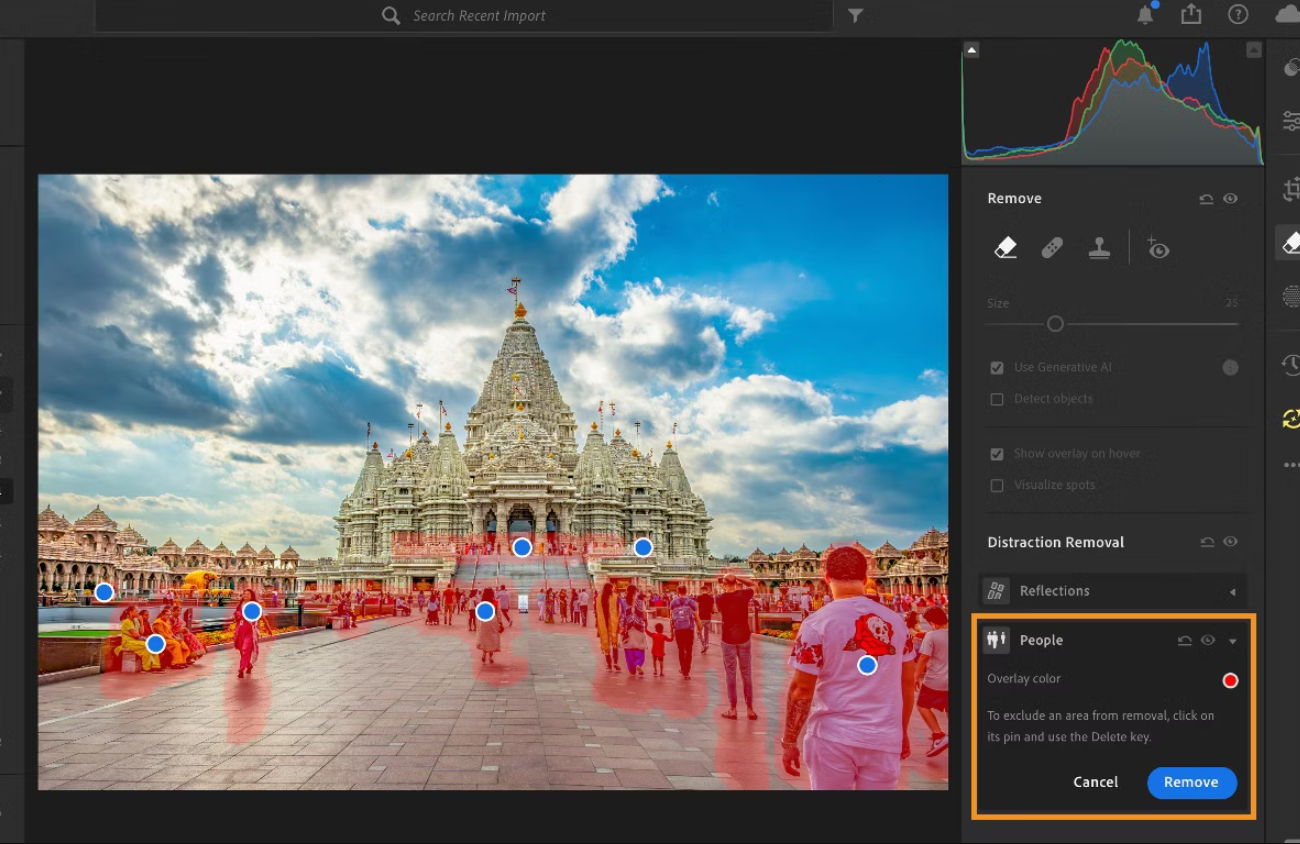 최신 버전의 Adobe Lightroom 2025에는 Generative Remove 기능이 추가되어, 한 번의 드래그로 사진 속 방해 요소를 깔끔하게 제거할 수 있습니다.