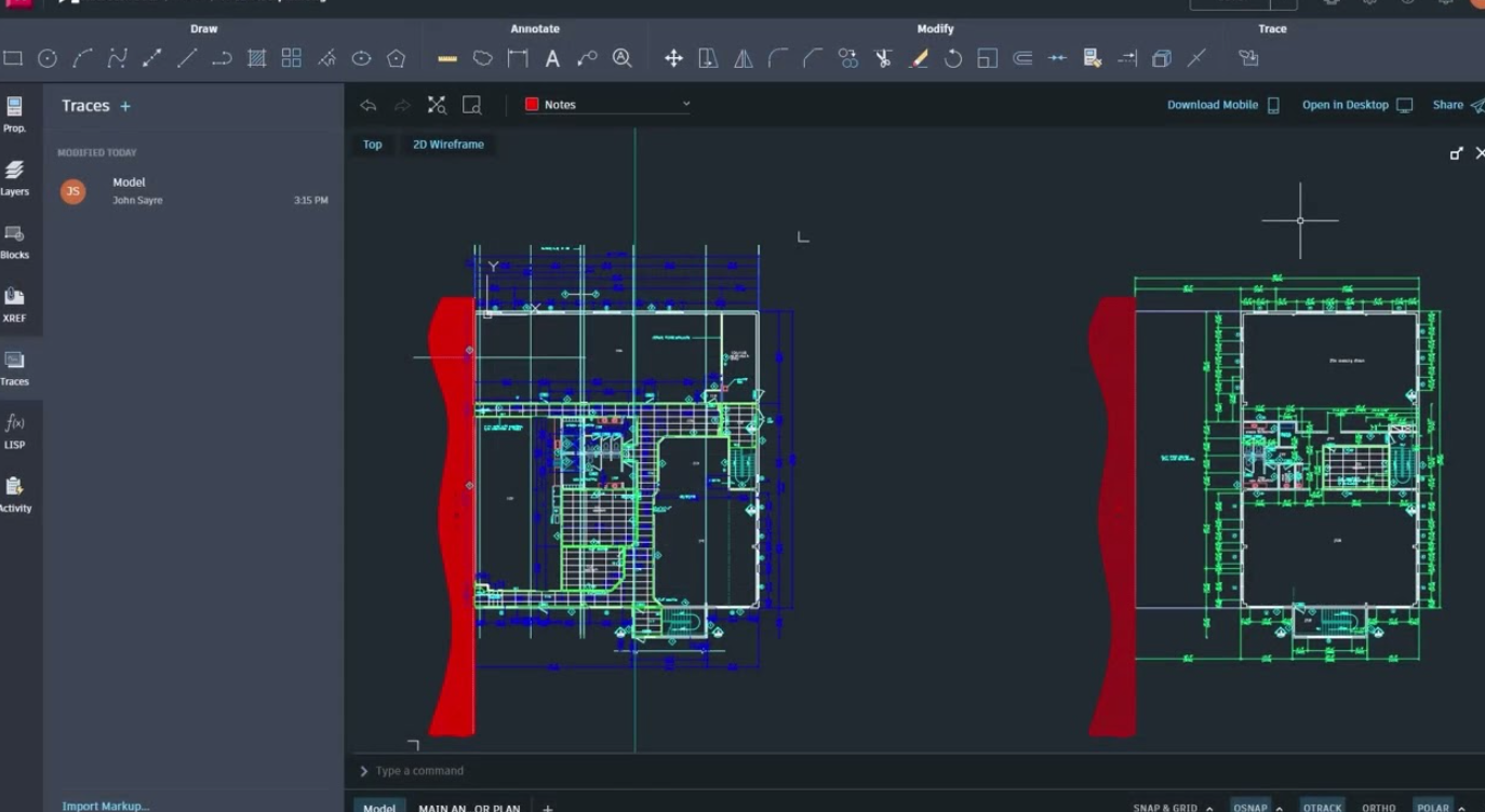 Trace 기능을 활용하면, 원본 도면을 건드리지 않고 별도의 레이어에 의견·수정 제안을 남길 수 있음